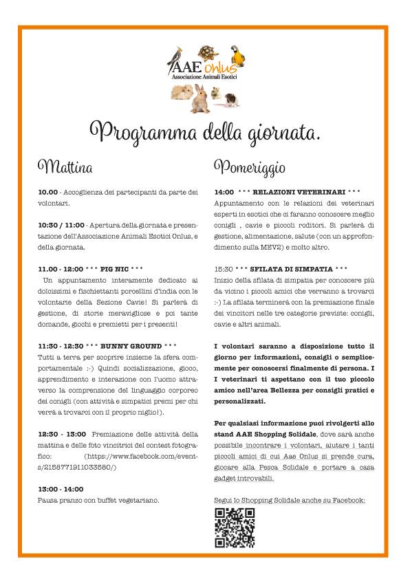 Il programma di queste manifestazioni, che si svolgono sempre gratuitamente e sono organizzate da AAE, comprende spesso attività che coinvolgono l'animaletto direttamente (foto, sfilate...) ma anche interessanti "lezioni" tenute da veterniari esperti dell'animale tema dell'incontro. In quest'occasione è possibile interagire con i veterinari, fargli esaminare il proprio esemplare e fargli controllare che sia a posto, ricevere consigli, e magari, anche se non è il caso di scroccare un'intera visita, sottoporgli eventuali problematiche dell'animale. I Veterinari che collaborano con AAE lavorano in cliniche sparse in diverse città d'Italia, e ovviamente sono specializzati in animali esotici.